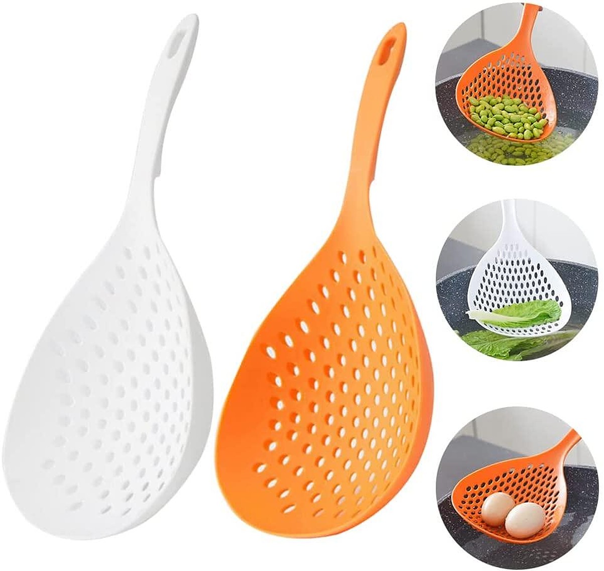 Practical tool & Multi-use: Skimmer spoons are suitable for both cold and hot food, you can use them instead of your kitchen strainers and colanders to strain pasta, meat, vegetables, fruit, roasted or boiled potatoes, tater tots, noodles, ravioli, gnocchi, Oil froth, eggs, etc. Also, you can use this scoop of colanders when you are washing your fruits and vegetables. Owning this allows you to use it on different occasions to save your cooking time. But do not use it in a Frying Pan.